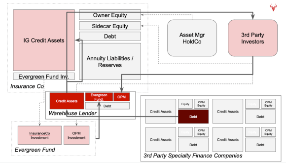 By pairing private credit with an insurance subsidiary, the LP funds can serve as the “first loss” equity tranche of the insurance portfolio. This juices up the reserves guaranteeing the liability/annuity book, thus enabling greater credit leverage to be assumed. The industry calls this sidecar equity, which promises higher returns given the greater risk involved (déjà vu?). This effectively represents leveraged debt squared.