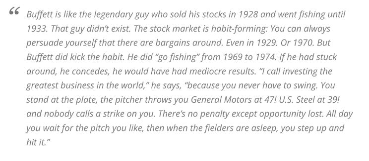 Since stock markets tend to be at least somewhat efficient, readers would be correct to assume that such stocks with a >50% gap between their price & value don’t show up all the time. This gives meaning to Buffett’s wisdom of “doing nothing” whenever he can’t find stocks which fit his strict investment criteria. When there are no opportunities with at least a >50% margin of safety, the correct course of action is to sit still & wait until such opportunities reveal themselves — cue Buffett’s analogy of stock markets being a “no-called-strike game”: