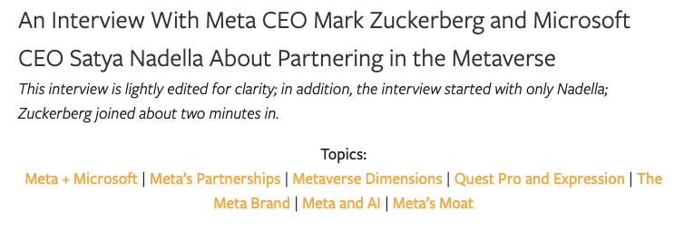 This other interview with Zuckerberg and Microsoft’s Satya Nadella with Ben Thompson of Stratechery last month lends itself to the same conclusion. Towards the end of the interview, Zuckerberg specifically and repeatedly mentions how they are approaching the Metaverse more from the social and consumer angle; rather than an enterprise angle. In the second-half of this interview (after Nadella leaves midway through), Zuckerberg provides extremely well fleshed-out answers to Ben’s questions about how the Metaverse will look like. Some of the topics discussed include: